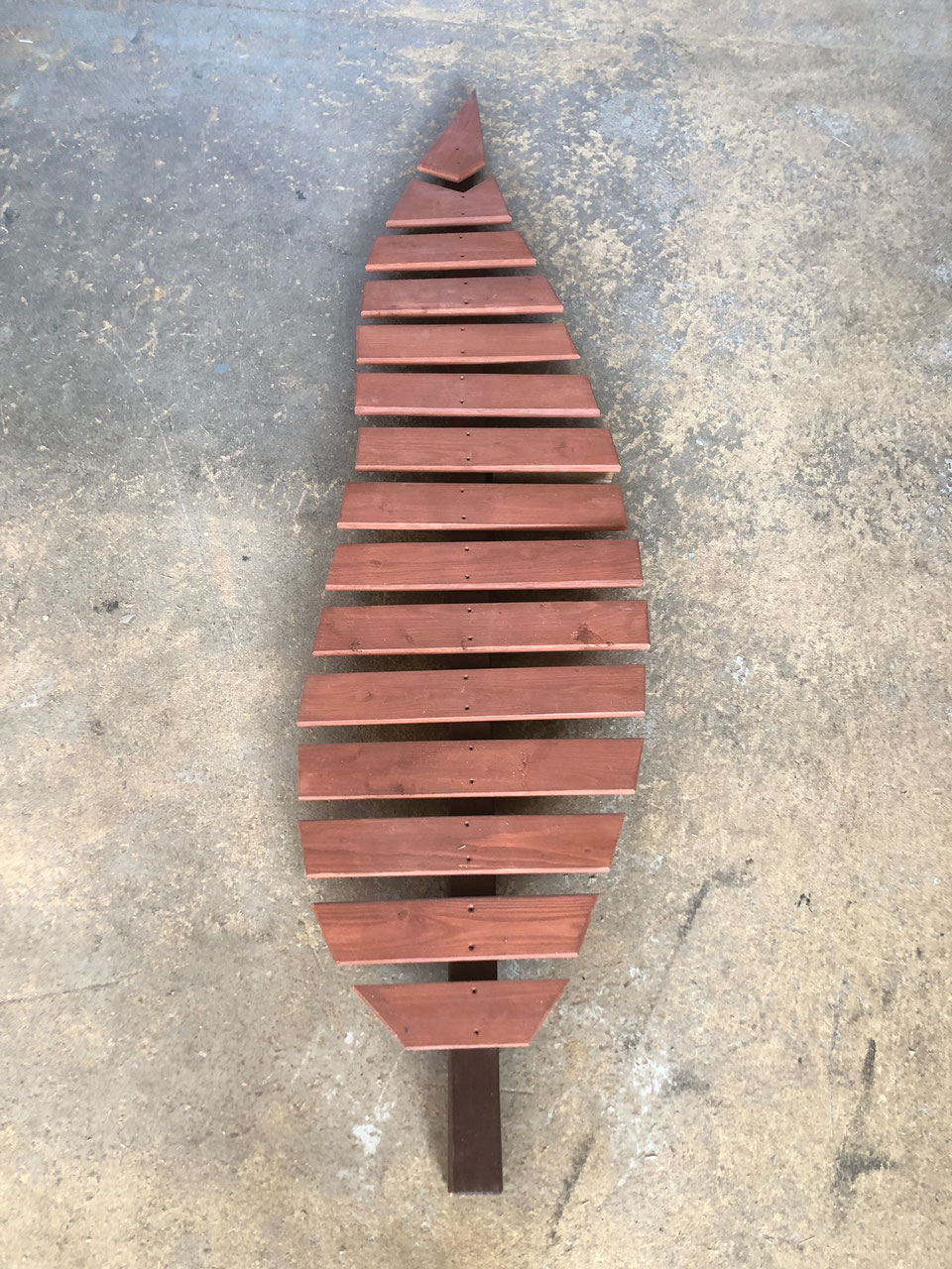 Dekoratives Gartenelement das an ein abstrahiertes Palmblatt, Pfeil, Feder, oder vieles mehr erinnert. Die angeschrägte, nach oben gerichtete Stellung der Leisten haucht der Skulptur eine kraftvolle, empfangende Form ein. Ein starkes Objekt mit viel Freiraum für eigene Assoziationen.